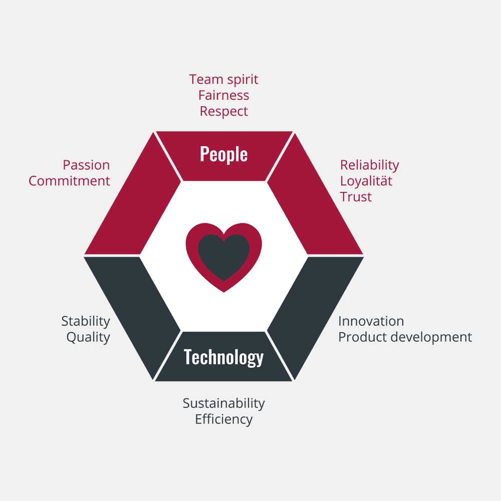 We guarantee our customers stability and quality through first-class materials and precise manufacturing processes that ensure reliable product performance. At the same time, we attach great importance to sustainability and efficiency by conserving resources and continuously optimizing economic processes. Innovation and product development drive us to constantly create new solutions that meet the requirements of tomorrow.